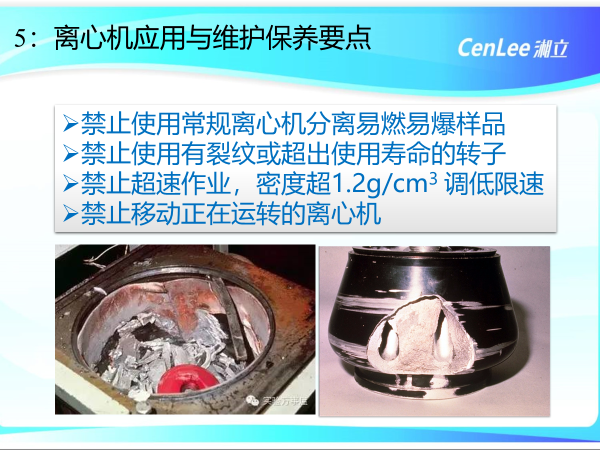禁止使用常规离心机分离易燃易爆样品;禁止使用有裂纹或超出使用寿命的转子;禁止超速作业,密度超1.2g/cm3 ,需要调低限速;禁止移动正在运转的离心机